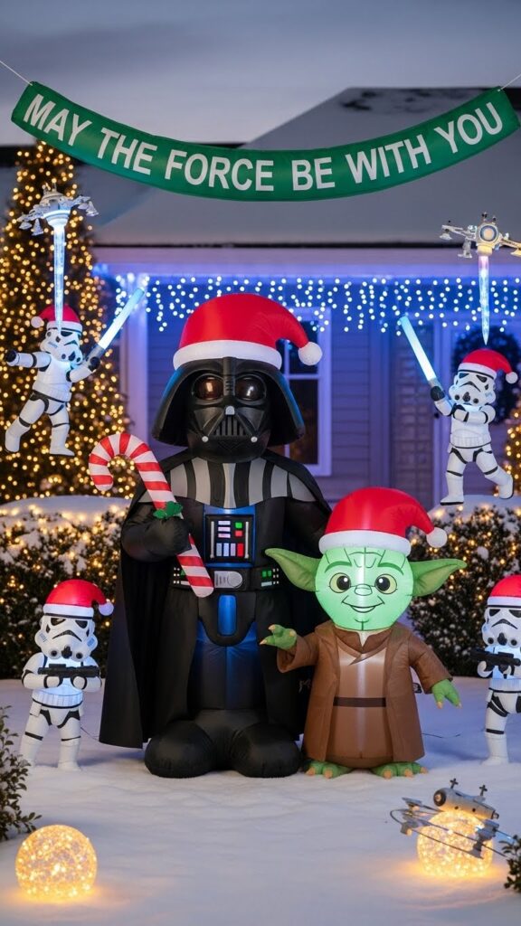 Pop culture Christmas inflatables work beautifully in displays that embrace personality and fun over traditional decoration rules. They’re perfect conversation starters that immediately identify you as fans and create connections with like-minded neighbors. Position these unique decorations prominently where their unexpected nature surprises and delights viewers—perhaps near entrances where visitors get an immediate sense of your household’s personality. Star Wars decorations resonate especially with families raising children in geek culture and with adult fans who appreciate seeing childhood favorites incorporated into adult holiday traditions. These decorations prove Christmas celebration can be personalized while remaining joyful.
