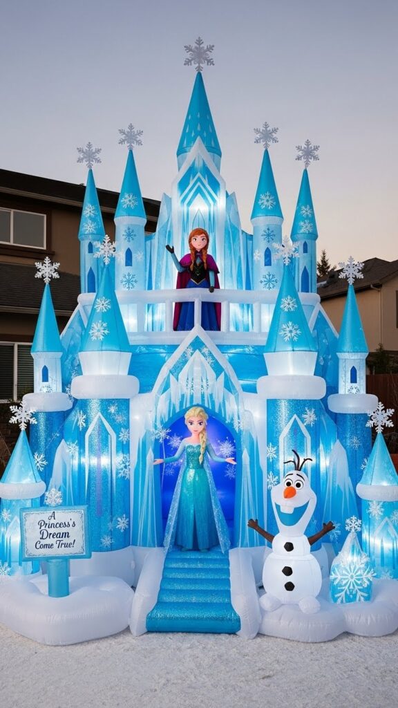 Frozen decorations work beautifully as centerpiece features that other winter decorations can support and surround. The princess and winter wonderland themes align perfectly with Christmas aesthetics while offering something more specific for devoted fans. Position castle inflatables prominently as focal points, with character inflatables arranged around them to recreate favorite movie moments. These displays photograph exceptionally well for social media sharing and create excitement for children who might be less interested in traditional Santa decorations. The Frozen theme’s association with sisterly love and family bonds reinforces important Christmas values.