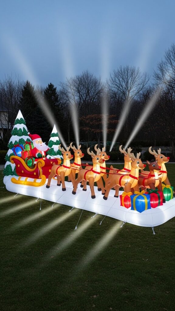 These comprehensive scenes require adequate space but deliver maximum impact, transforming yards into true Christmas destinations. Position the display to suggest Santa is either preparing for takeoff or has just landed on your roof to deliver presents. The multi-piece design allows for creative arrangement—angle the reindeer to follow your yard’s contours or position them climbing toward the sky. This classic Christmas imagery resonates universally, creating displays that honor traditional holiday symbolism while utilizing modern inflatable technology for easy setup and dramatic nighttime illumination.