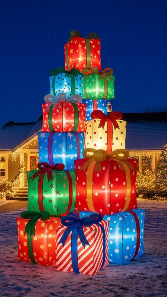 Present stack inflatables offer versatility that complements any decorating style or theme. They work equally well in traditional Christmas displays or contemporary minimalist approaches to holiday decorating. Position these cheerful decorations flanking entryways, lining walkways, or grouped together to create a “present pile” effect under trees or near your home’s entrance. The universal symbol of wrapped gifts resonates with everyone who celebrates gift-giving traditions, making these inflatables crowd-pleasing additions that spread joy without specific religious or cultural associations.