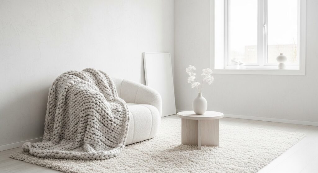 White doesn’t have to feel cold or clinical. The trick is layering different textures — a bouclé chair, a chunky knit throw, a shaggy rug — so every surface invites you to touch it. This creates visual richness without adding a single drop of color.