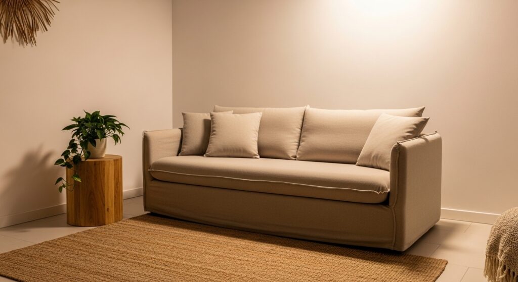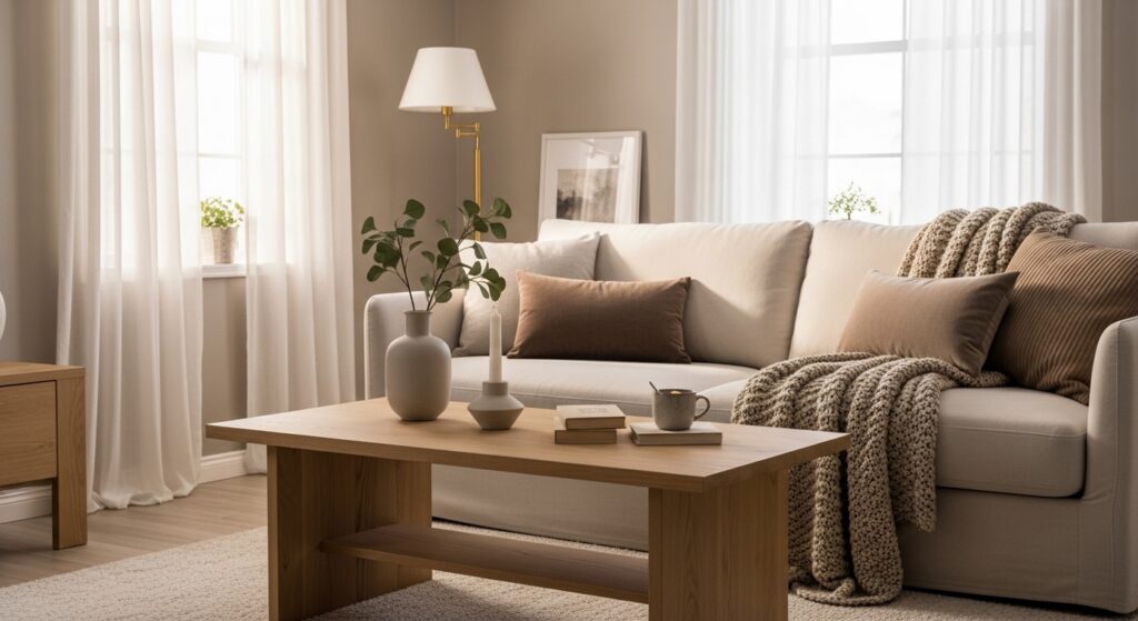 A beige sofa is one of the smartest investments for a neutral living room — it’s versatile, timeless, and anchors the whole space. Style it with a jute rug, wooden accents, and a single potted plant for an effortlessly organic feel that never goes out of style.