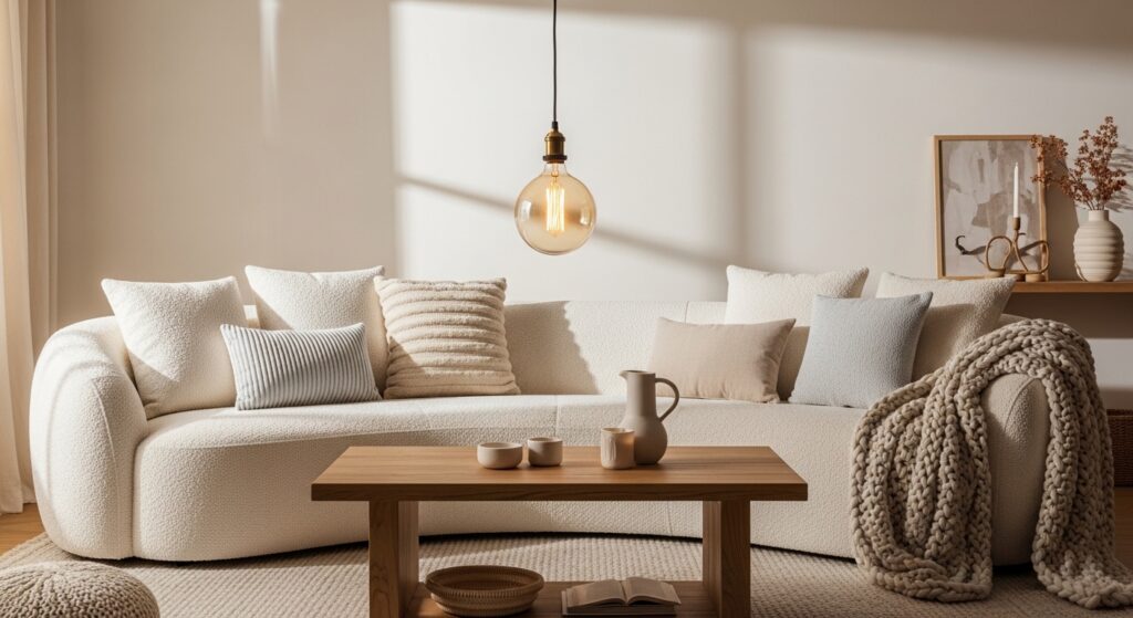 A bouclé sofa is having a serious moment — and for good reason. The soft, loopy texture catches the light beautifully, especially under warm-toned bulbs. Pair it with an oversized pendant lamp and a pile of cream throw pillows for the ultimate hygge vibe.