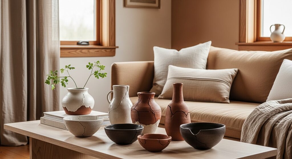 Wabi-sabi celebrates imperfection — and in a neutral room, it creates incredible authenticity. Hand-thrown clay vases, organic linen, rough-edged ceramics, and objects with visible history all add soul to a space that might otherwise feel too polished or perfect.