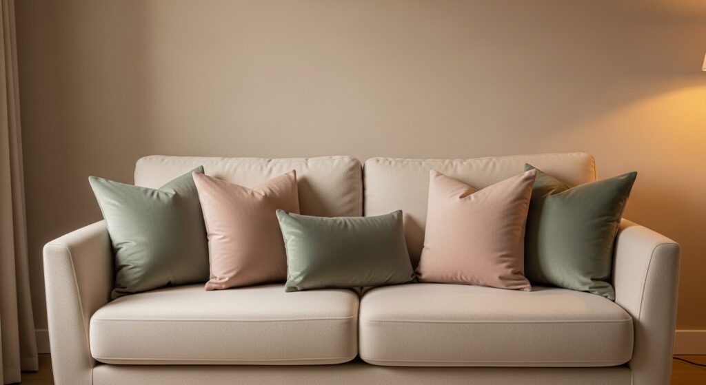 Velvet is the secret weapon of the neutral living room. Even in muted tones — dusty sage, faded blush, or warm mauve — it adds an instant sense of luxury and depth. A couple of velvet throw pillows on a cream sofa is all you need.