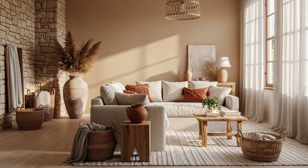 Draw your palette straight from nature — sandy floors, stone-gray walls, and warm terracotta accents. This earthy trio creates a room that feels grounded and serene. A few woven baskets add texture while keeping the mood calm and collected.