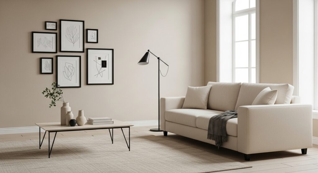 Black accents in a neutral room act like punctuation marks — they give the eye a place to rest and add definition without disrupting the calm. Think thin black frames, a sleek metal lamp, or hairpin coffee table legs. It’s quiet contrast done right.