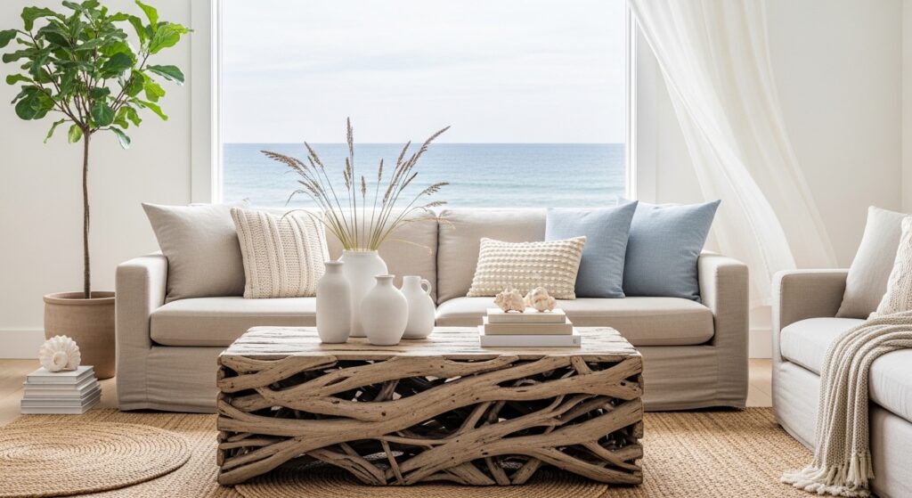 Coastal doesn’t have to mean nautical kitsch. Strip it back to nature’s own palette — sandy linens, driftwood textures, and the soft blue-gray that echoes the ocean. The result is a breezy, effortless room that feels like a permanent vacation.