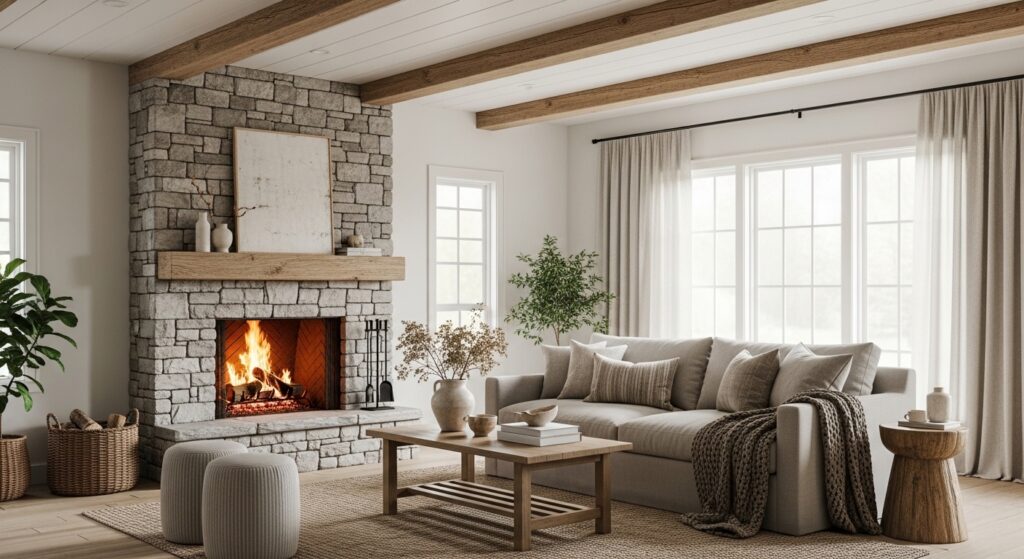 Exposed wood beams are the kind of architectural detail that does all the heavy lifting for you. In a neutral room, they add warmth, character, and a sense of history. Pair with a stone fireplace and white walls and you have a space that feels genuinely timeless.
