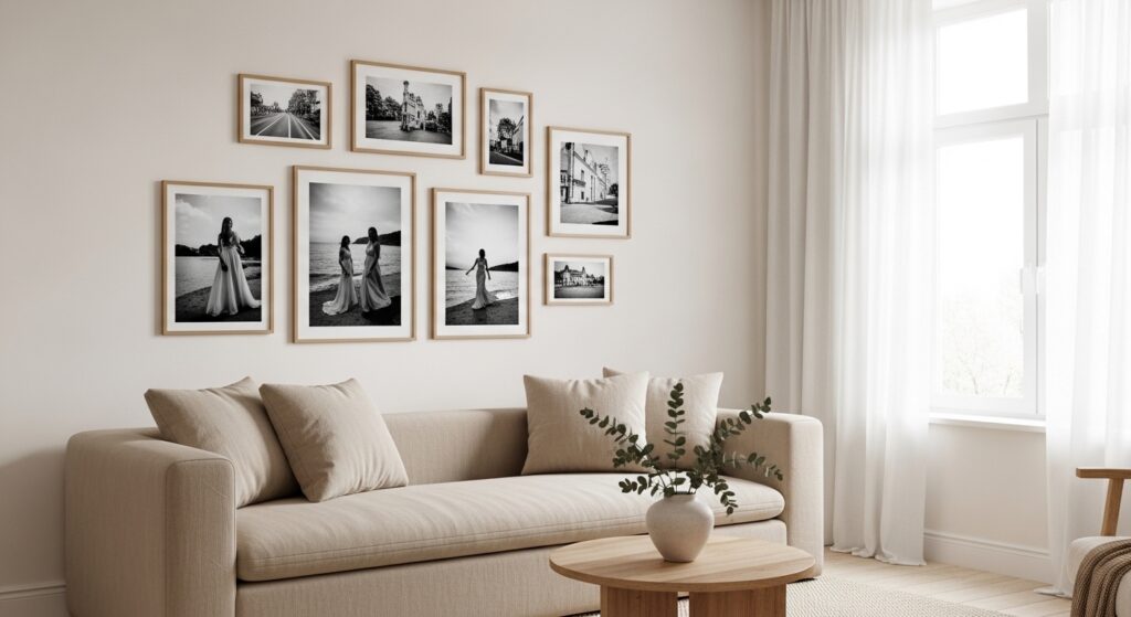 A gallery wall doesn’t have to be colorful to be interesting. Stick to black-and-white photography, charcoal sketches, and sepia prints in simple wooden or black frames. The result is a curated, artistic display that feels personal without disrupting the calm palette.