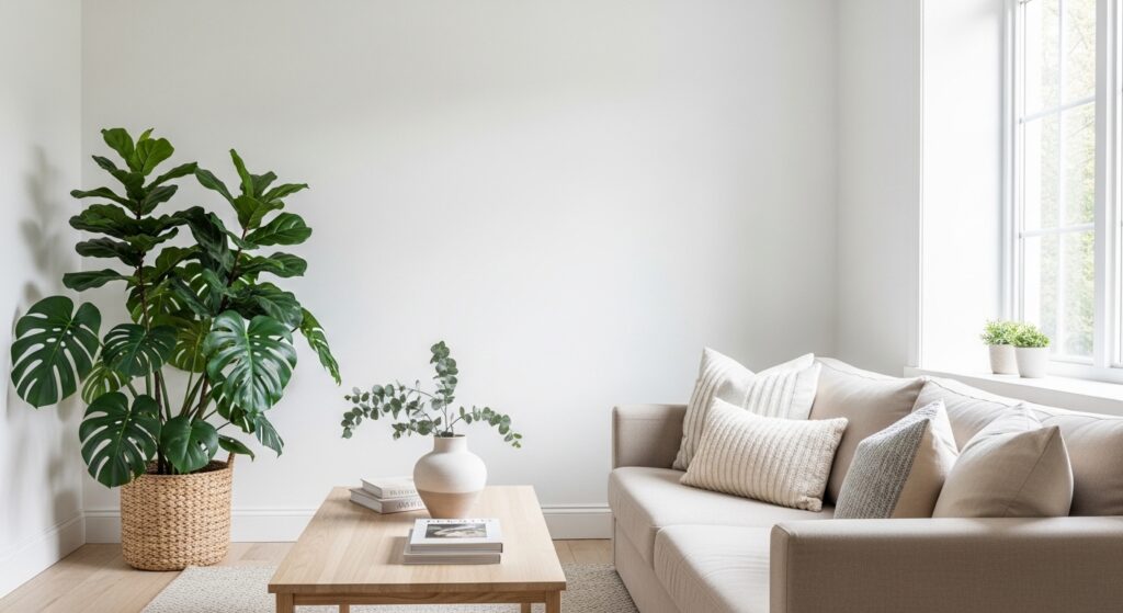 Sometimes all a neutral room needs is a single living thing. One large, lush plant—a monstera, a fiddle leaf fig, or an olive tree—brings nature inside and adds the only color accent the room truly needs. It’s the most effortless styling decision you’ll ever make.