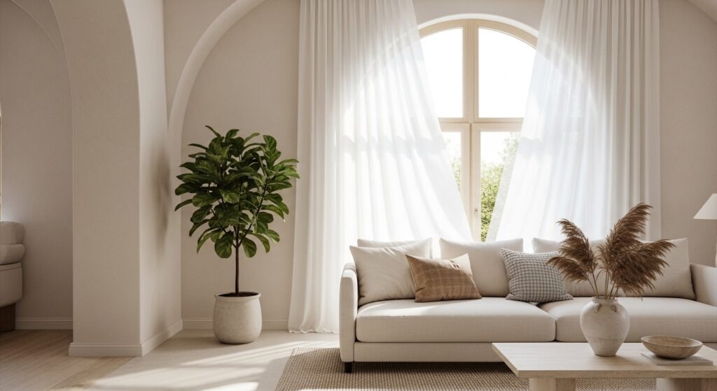 An arched window is an architectural dream in a neutral room — it adds drama and elegance without needing any extra decor. Let sheer linen curtains filter the light softly. The natural glow does more for your space than any lamp ever could.
