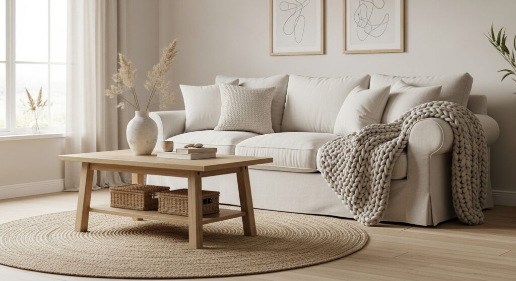 This layering creates that styled, magazine-ready appearance while remaining completely functional. Blankets invite people to curl up and get comfortable, making your living room actually feel livable. Store additional blankets in decorative baskets within easy reach for temperature flexibility. Change them seasonally for fresh looks without major investment lightweight linens for summer, heavy wools for winter. This simple addition makes your space look styled and feel welcoming simultaneously.