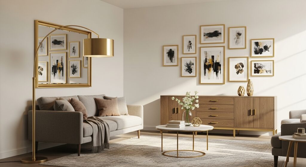 Brass and gold accents add warmth and subtle luxury that elevates any living room effortlessly. A brass floor lamp provides both lighting and sculptural interest with its warm metallic glow. Gold-framed mirrors and artwork catch light beautifully while adding refined elegance. These warm metals create sophistication without the coldness of silver or chrome finishes.