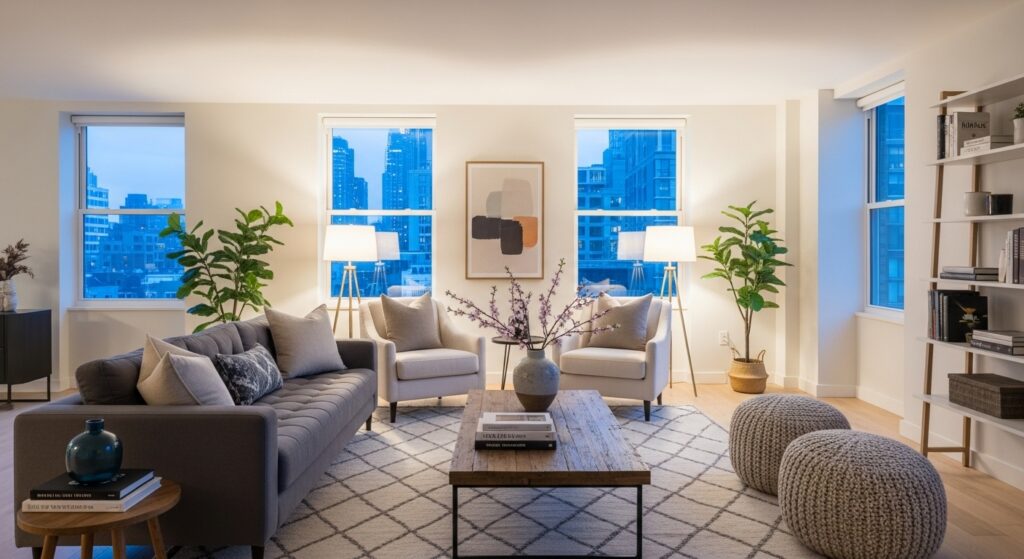 A beautiful area rug instantly grounds your seating area and adds color, pattern, or texture. Choose a rug large enough that all furniture front legs rest comfortably on it this creates visual cohesion. A patterned rug adds personality and hides wear in high-traffic areas better than solid colors. The rug becomes your room’s foundation, tying together disparate furniture pieces into a cohesive arrangement.