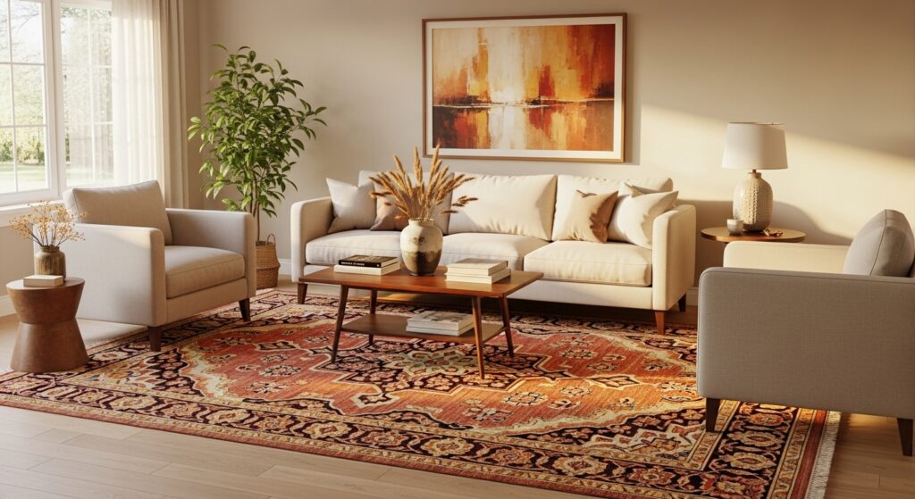 Rugs also add essential softness underfoot and help absorb sound in rooms with hard flooring. Warm colors in rust, terracotta, or golden tones create inviting atmosphere. Geometric patterns suit modern spaces while traditional patterns complement classic decor. This single addition transforms how your living room looks and feels, making it appear more finished, intentional, and pulled together without requiring any other changes.