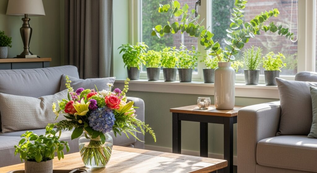 Fresh flowers and greenery add life, color, and natural beauty that artificial alternatives cannot match. A simple bouquet on your coffee table creates an instant focal point with vibrant color and delicate fragrance. Potted herbs on windowsills provide fresh scents and practical use in cooking. Eucalyptus branches in tall vases add height and subtle aroma that lasts weeks.