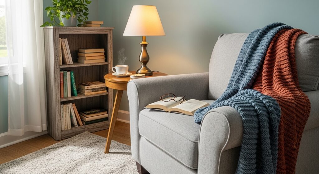 This intentional space carved from existing rooms costs little but adds significant lifestyle value. A small bookshelf nearby keeps favorite reads accessible and adds vertical storage. The defined purpose makes you more likely to actually use the space regularly. This cozy corner provides a spot for morning coffee, afternoon reading, or evening reflection a personal sanctuary within your living room.