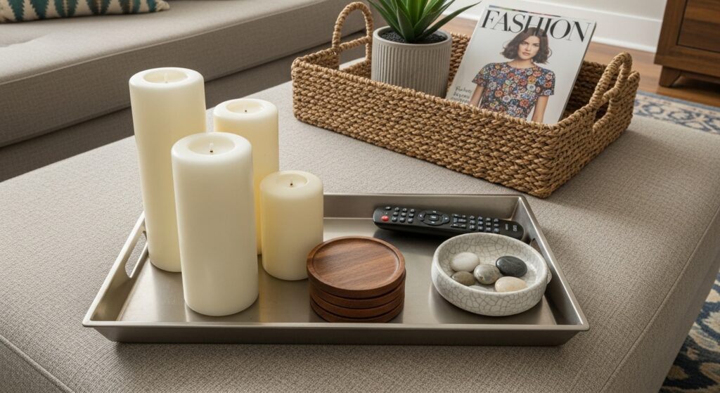 Decorative trays organize small items while adding style and preventing surfaces from looking cluttered. Use a tray on your coffee table to corral remotes, coasters, and candles in one attractive arrangement. On ottomans, trays create stable surfaces for drinks or decorative items. Choose materials that complement your style brass for glamour, wood for organic warmth, marble for modern luxury.