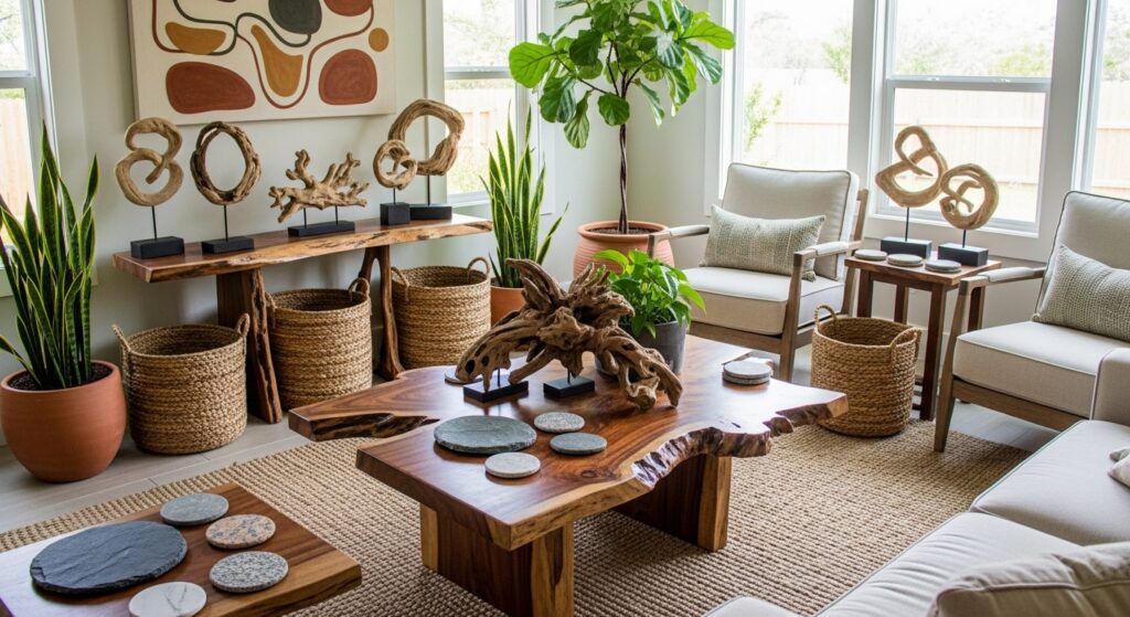 Natural materials create warmth and organic beauty that synthetic elements cannot replicate. A live edge wood coffee table celebrates the tree’s original shape with unique character. Driftwood pieces become sculptural décor elements with weathered beauty. Stone coasters and natural fiber baskets add textural interest while serving practical purposes.