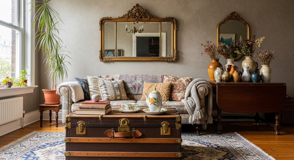 Vintage pieces add soul and character that brand-new furniture cannot replicate. An old trunk repurposed as a coffee table provides storage while telling stories of past adventures. Antique mirrors add ornate detail and reflect light beautifully throughout your space. Thrifted ceramics and inherited furniture connect you to history while adding unique elements no neighbor will have.