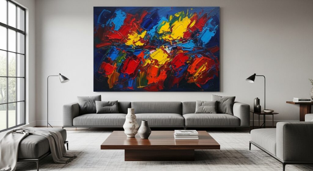 One large piece of art makes more impact than multiple small pieces scattered across walls. Oversized artwork commands attention and creates instant focal points that anchor entire rooms. A bold abstract painting above your sofa adds color, personality, and confident style. The dramatic scale simplifies decorating no complex arrangements or perfect spacing required.