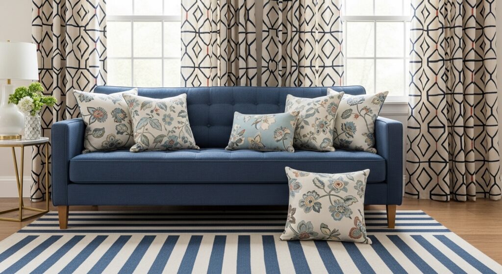 Pattern mixing adds visual interest and personality when done with intention and a cohesive color palette. Start with a foundational pattern in your rug stripes, geometric, or traditional. Add complementary patterns in pillows, varying the scale pair large florals with smaller geometric prints. Solid furniture provides visual rest between patterned elements, preventing overwhelming busy-ness.