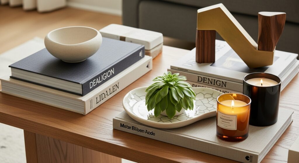 Keep the arrangement functional leave space for actual coffee cups and feet on the table. Use the rule of odd numbers, grouping items in threes or fives for naturally balanced compositions. Vary heights by stacking books or using items of different sizes to create visual interest. This intentional styling takes minutes but transforms your coffee table from basic furniture into a curated focal point that demonstrates design awareness.