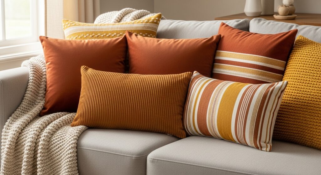Mix patterns and solids within your seasonal palette for sophisticated layering. Use various sizes larger in back, smaller in front for professional depth. This approach lets you experiment with trends without permanent commitment or major investment. Store off-season pillows in vacuum bags to save space, making rotation effortless when seasons change. Your living room feels refreshed four times yearly with minimal effort.