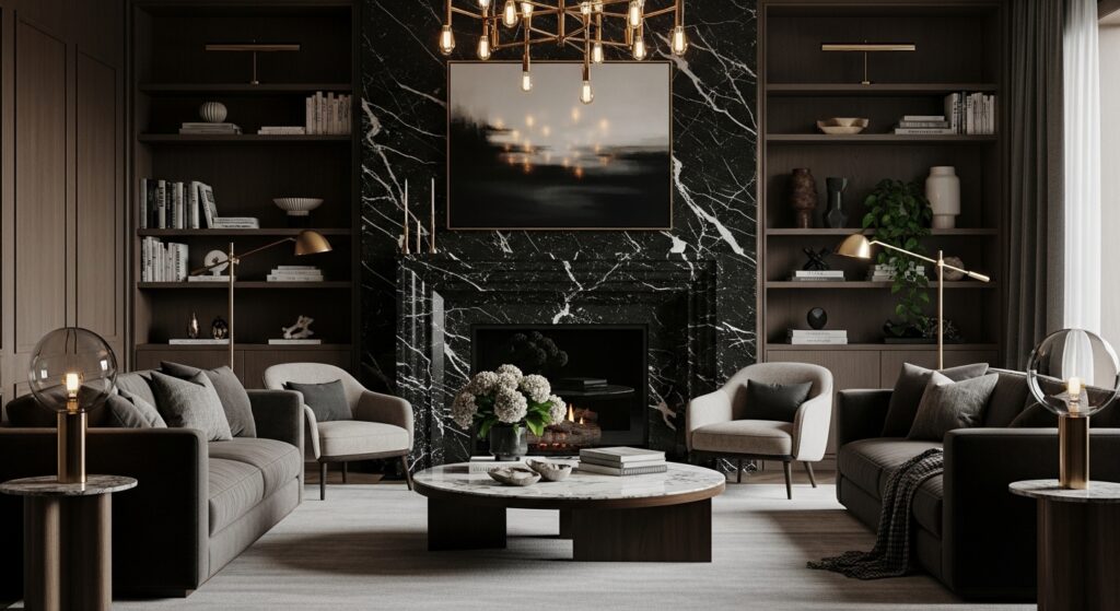 Dark stone or marble adds substantial luxury and permanent architectural drama to moody living rooms. Install a dark marble fireplace surround in black, deep green, or charcoal with dramatic veining. Create an accent wall in stacked black stone or slate for three-dimensional texture. Use dark marble or soapstone for a coffee table or side tables for functional beauty. The natural material adds organic texture and patterns created by geological processes over millennia.