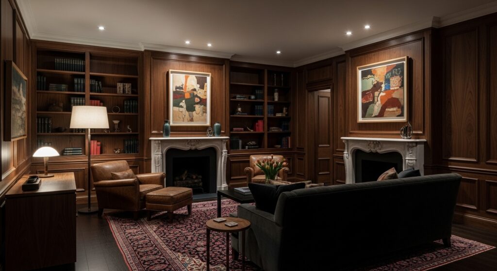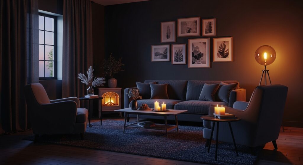 The key is having control—dimmers on all fixtures allow you to adjust lighting based on mood, activity, and time of day. Warm-toned bulbs (2700K or lower) create golden light that enhances rather than fighting your moody color palette. The varied light sources eliminate dark corners while maintaining overall atmospheric intimacy. Task lighting for reading or working prevents eye strain while ambient lighting creates mood and atmosphere. This layered approach ensures your moody living room functions beautifully for all activities while maintaining its dramatic, sophisticated character at all times.
