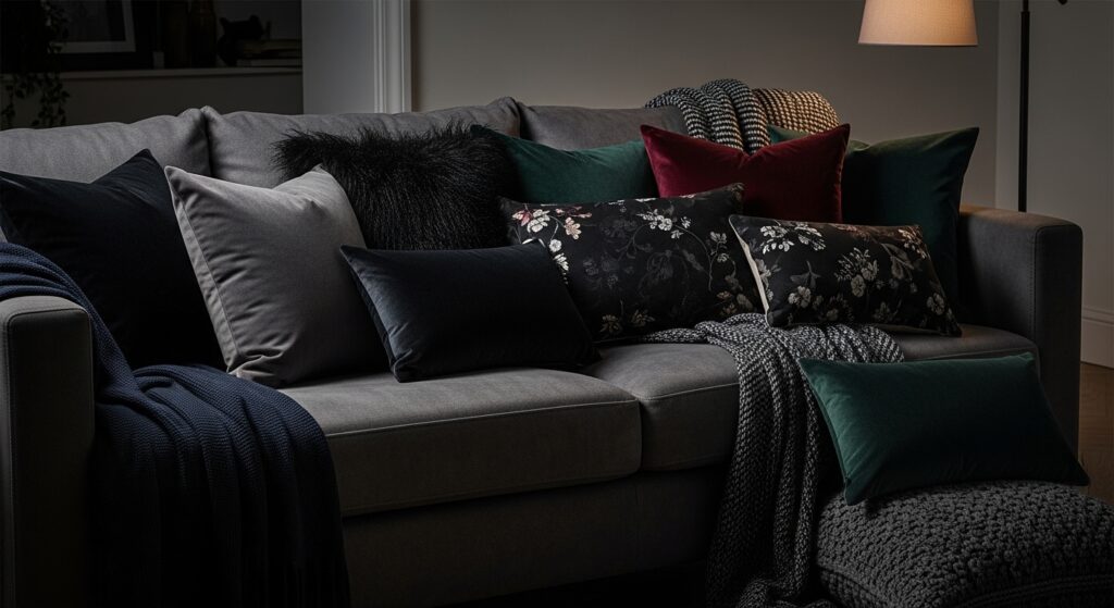 Dark throw pillows in varied textures add essential comfort and visual layering to moody living room seating. Choose pillows in charcoal velvet, black silk, deep burgundy, forest green, and midnight blue for tonal variation within the dark palette. Mix textures—smooth, nubby, embroidered, fringed—for dimensional interest that catches light differently throughout the day. Layer pillows in odd numbers and varied sizes for professional, styled appearance. The dark pillows add comfort without introducing light colors that disrupt your moody atmosphere.