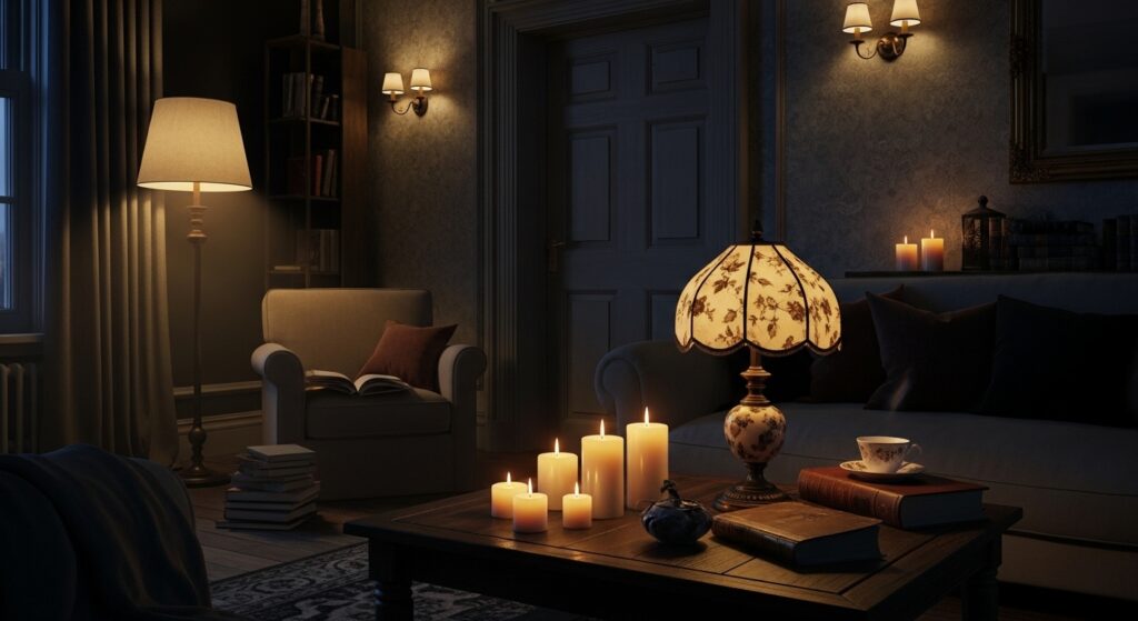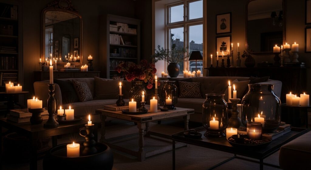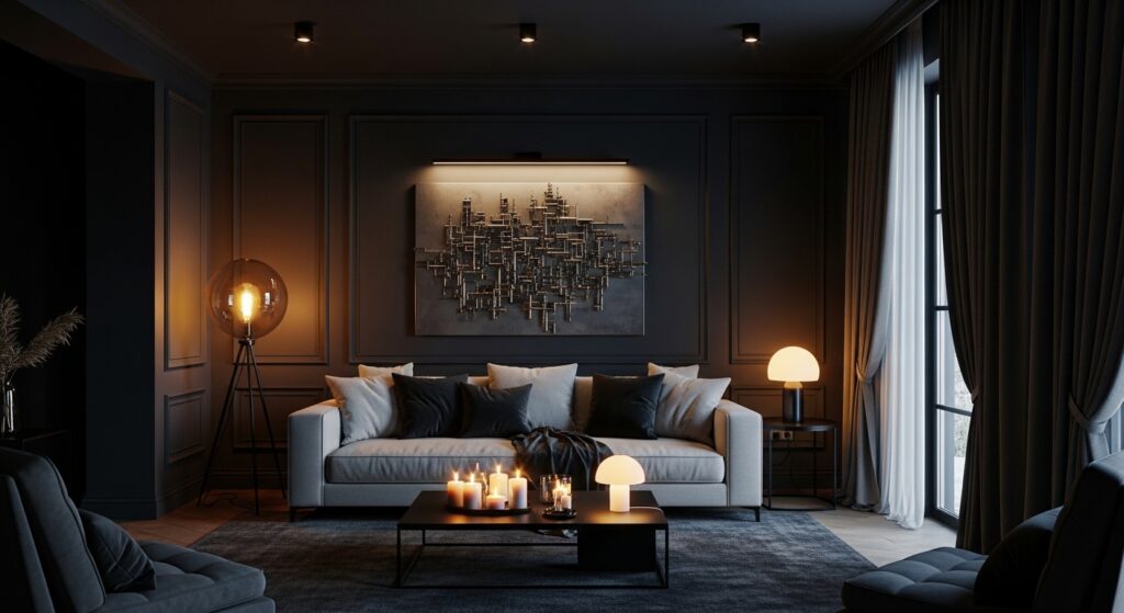 Proper lighting is absolutely critical in moody living rooms to prevent darkness from becoming oppressive or dysfunctional. Install multiple light sources at varying heights—floor lamps in corners, table lamps on side tables, wall sconces flanking artwork or mirrors. Add candles on surfaces for flickering, romantic ambient light. Each source creates its own pool of warm illumination, building layers of light throughout the space without harsh overhead fixtures.
