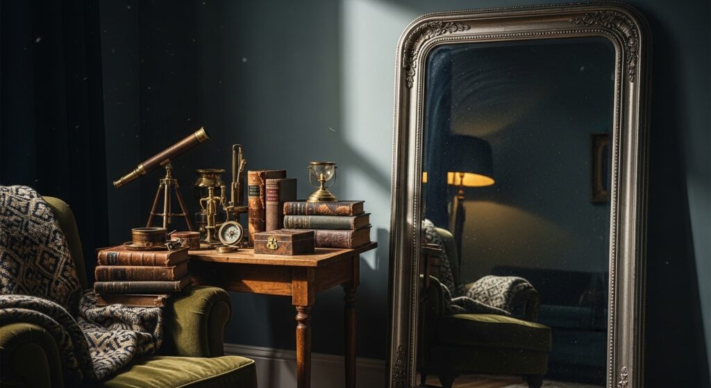 Antique and vintage elements add history, patina, and authentic character essential to sophisticated moody living rooms. Hang an antique mirror with ornate gilded frame that’s developed beautiful age and character. Add a vintage side table with worn finish that tells stories of previous lives. Display aged brass candlesticks, vintage leather-bound books, and antique decorative objects throughout your space. These pieces prevent moody rooms from feeling too new or staged.