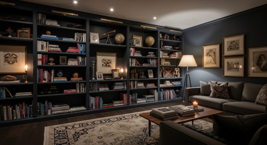 Dark built-in shelving creates architectural interest while providing functional storage and display opportunities. Install floor-to-ceiling shelving in dark stained wood or matte black paint flanking fireplaces or filling entire walls. Style shelves with books, dark decorative objects, brass accents, and small plants against the dark backdrop. The built-ins add custom, permanent architectural detail that increases perceived value. Dark shelving creates depth and makes displayed objects pop rather than disappearing against the background.