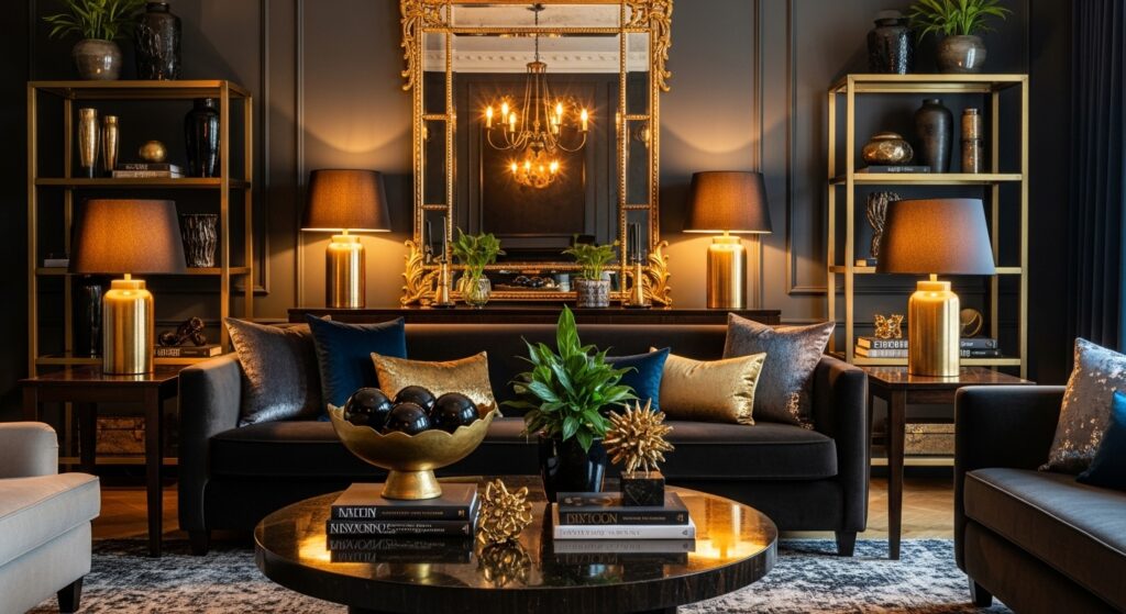 Warm metallic accents provide essential light reflection and glamorous contrast in moody living rooms. Add a large gold-framed mirror that catches and multiplies available light while adding sophisticated shine. Choose brass or gold table lamps with warm bulbs that create pools of golden illumination. Incorporate metallic accessories—picture frames, candle holders, decorative objects—in coordinating warm finishes throughout your space. The metallic shimmer prevents dark rooms from feeling flat or dull.