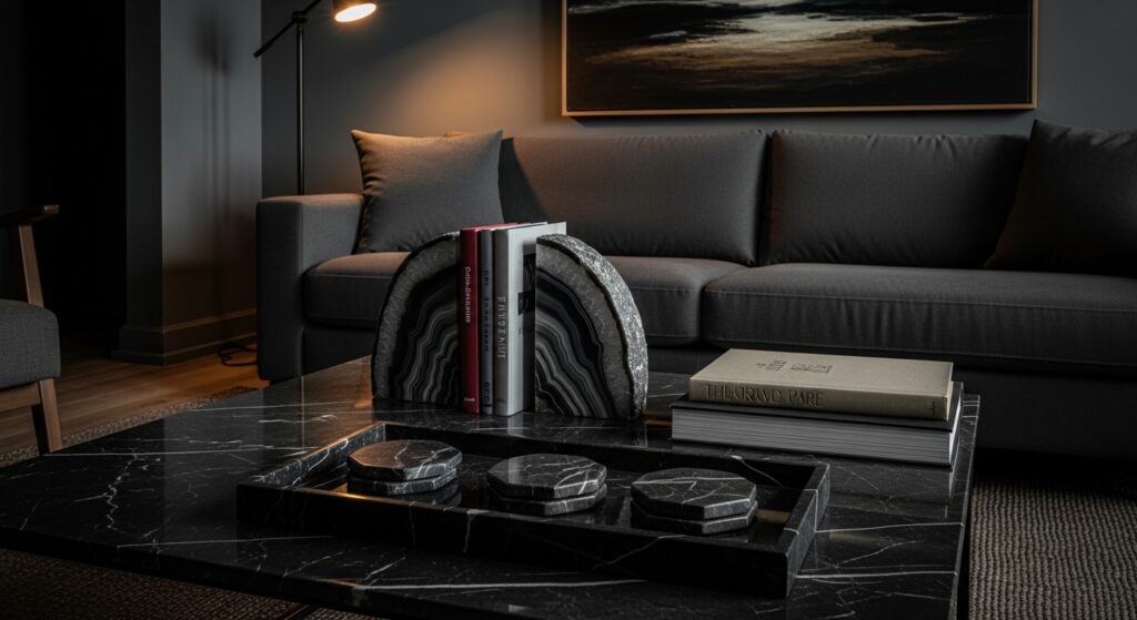 Dark stone and marble accessories add natural luxury and geological beauty throughout moody living rooms. Use a black marble tray on your ottoman or coffee table to corral smaller items elegantly. Add dark stone coasters in black marble, slate, or granite for functional beauty. Display agate or geode bookends in dark charcoal or deep blue on shelves. These natural materials add organic texture and patterns created over millions of years.