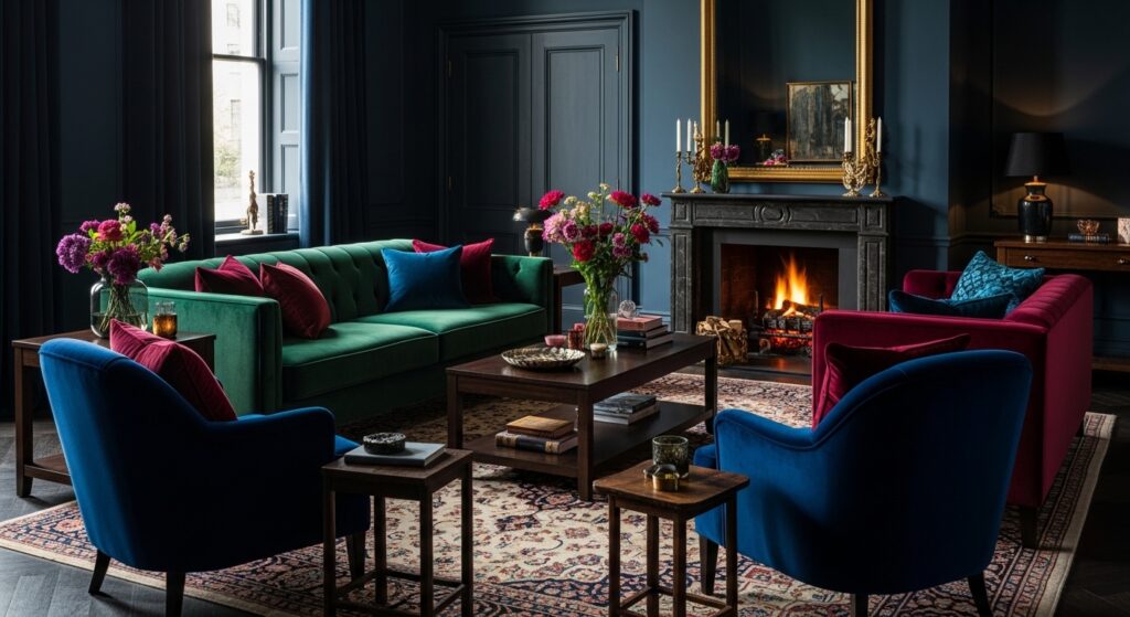 Velvet in rich jewel tones adds incredible depth, luxury, and tactile pleasure essential to moody living rooms. Choose a statement sofa in emerald green, deep sapphire blue, or rich burgundy velvet that commands attention immediately. Add velvet chairs or ottomans in complementary jewel tones for layered richness and visual interest. Velvet cushions in varying jewel shades create dimensional color that shifts beautifully as light changes throughout the day.