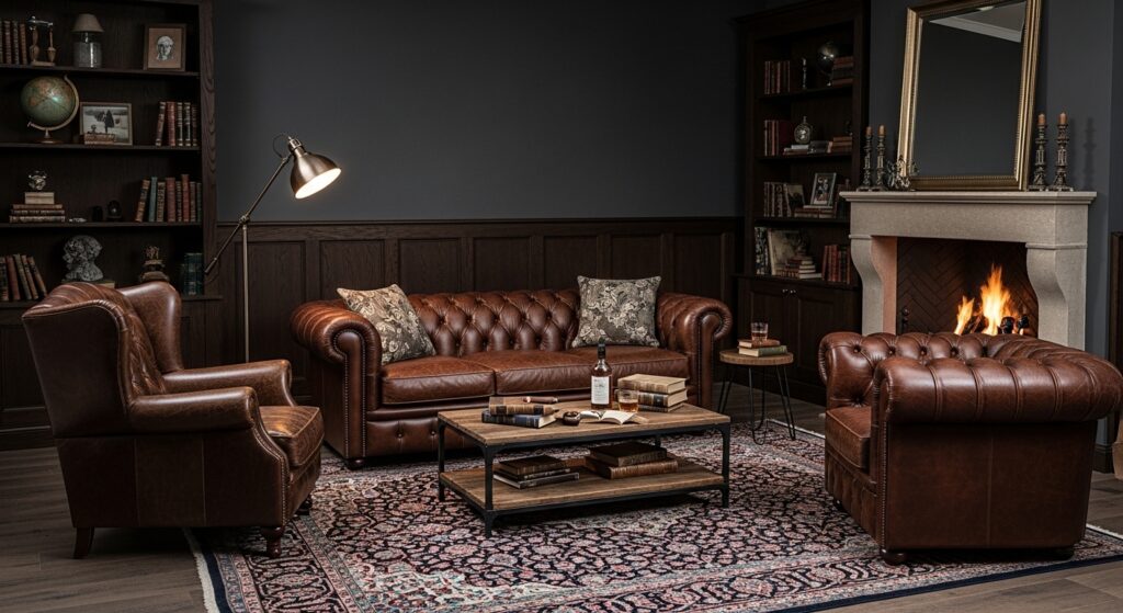 Dark leather furniture adds masculine sophistication and rich texture perfect for moody, dramatic living rooms. Choose a classic Chesterfield sofa in deep brown, cognac, or black leather with traditional button tufting. Add leather armchairs that develop beautiful patina over time, showing character and use. The natural material adds warmth and organic texture while maintaining the dark, sophisticated aesthetic. Leather ages beautifully, becoming softer and more attractive with years of use.