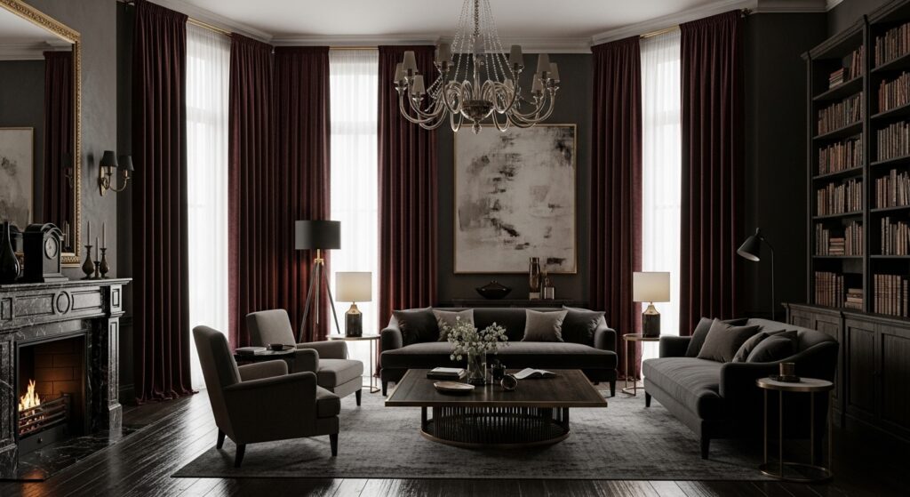 Heavy, dramatic curtains add essential luxury and complete light control in moody living rooms. Install floor-to-ceiling curtains in rich velvet, heavy linen, or silk in deep burgundy, charcoal, or black. Hang them high and wide to create illusions of height and maximize dramatic impact. The substantial fabric adds vertical drama and frames windows like artwork. Heavy curtains provide excellent light control, allowing you to create complete darkness or filtered atmospheric light as desired.