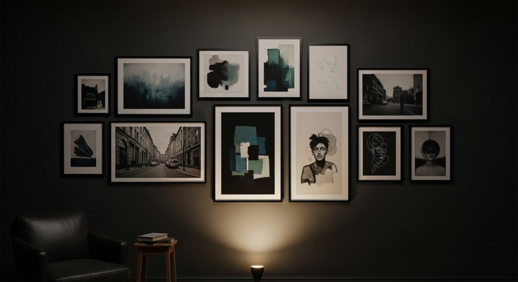 Black-framed artwork creates cohesive gallery walls that maintain moody aesthetics while displaying varied art and photography. Choose frames in matte black that coordinate across different sizes and styles of artwork. The consistent dark frames create visual unity regardless of what’s inside—mix black and white photography, colorful abstract pieces, botanical prints, and personal photos. The black frames virtually disappear against dark walls, allowing artwork to float and command attention without frame distraction.