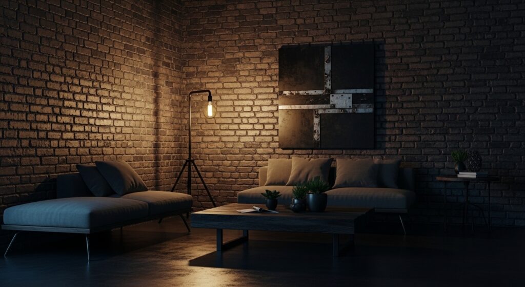 Exposed brick in dark tones adds incredible texture and urban, industrial character to moody living rooms. If you’re fortunate to have original brick, consider painting it in deep charcoal or black for dramatic effect while preserving texture. Faux brick panels or wallpaper create the look without structural brick if needed. The three-dimensional texture adds depth and shadow play that flat walls cannot achieve. Dark brick creates that loft-like, urban sophistication perfect for modern moody aesthetics.