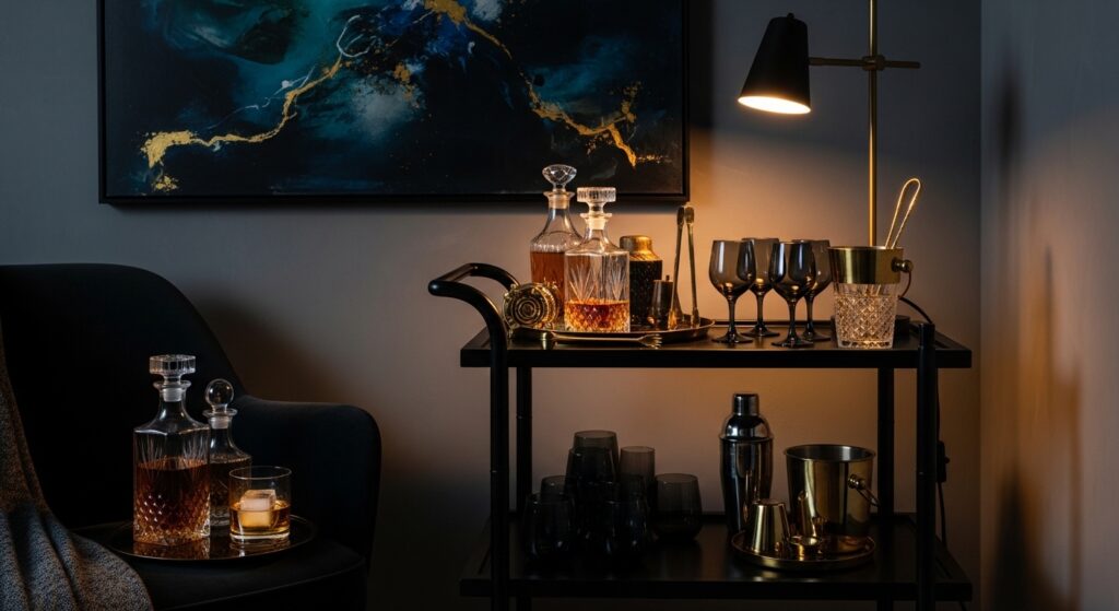 A well-styled bar cart adds functional glamour and creates a sophisticated entertaining focal point in moody rooms. Choose a bar cart in black metal, dark wood, or brass with glass shelves. Style it with crystal decanters filled with amber spirits, dark glassware, and brass bar tools. Add a small dark plant or dramatic flowers in a black vase for organic contrast. The bar cart becomes both functional storage and attractive display that demonstrates refined entertaining readiness.