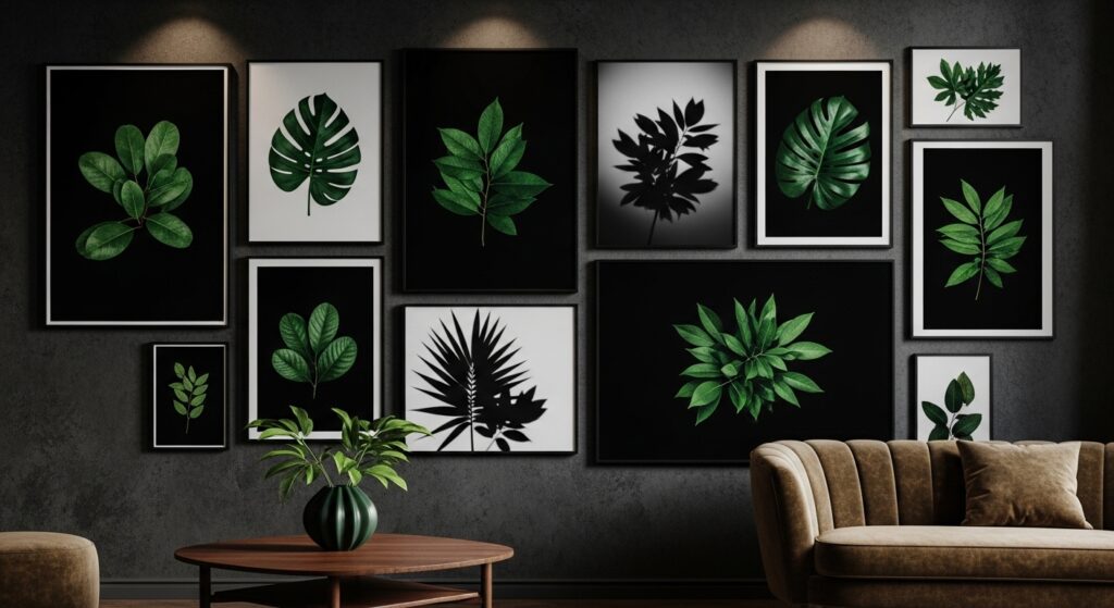 Botanical artwork maintains the moody aesthetic while introducing essential organic elements and natural beauty. Choose prints featuring deep green tropical leaves, ferns, or dramatic flowers against black backgrounds. Dark botanical photography with heavy shadows creates mystery and drama rather than bright, cheerful garden vibes. Frame prints in matte black for cohesive gallery walls or as standalone statement pieces. The natural subject matter softens the moody palette without introducing jarring bright colors.