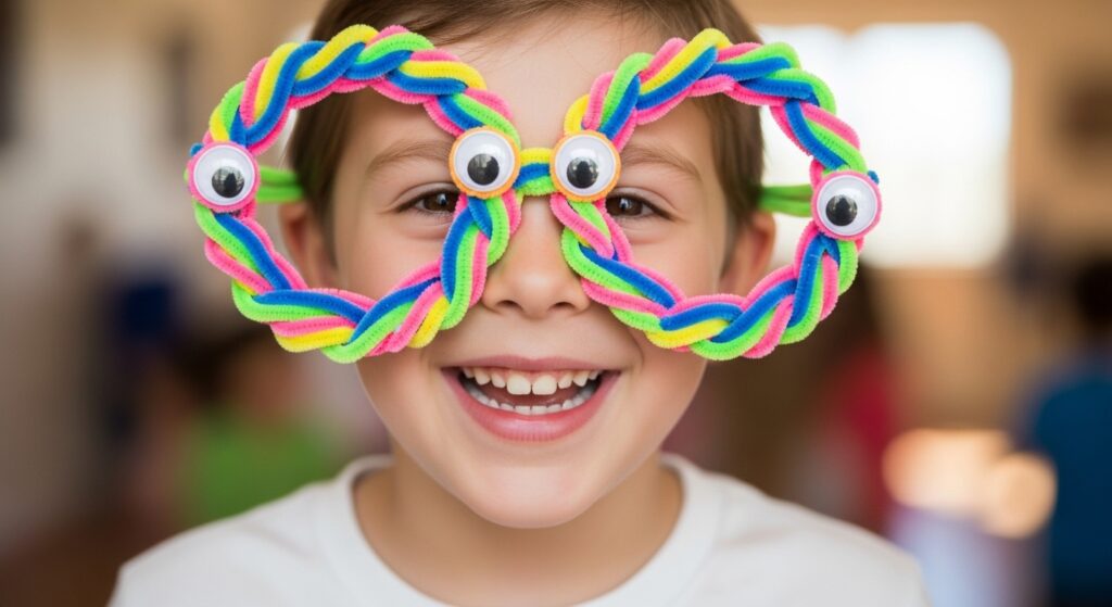 Form oversized eyeglass frames from pipe cleaners, creating silly photo props or dress-up accessories. Kids design unique styles—round, square, star-shaped, or wild decorative frames. This wearable craft encourages creativity, humor, and self-expression while producing props for dramatic play, photo sessions, or costume boxes that extend play value beyond crafting time.
