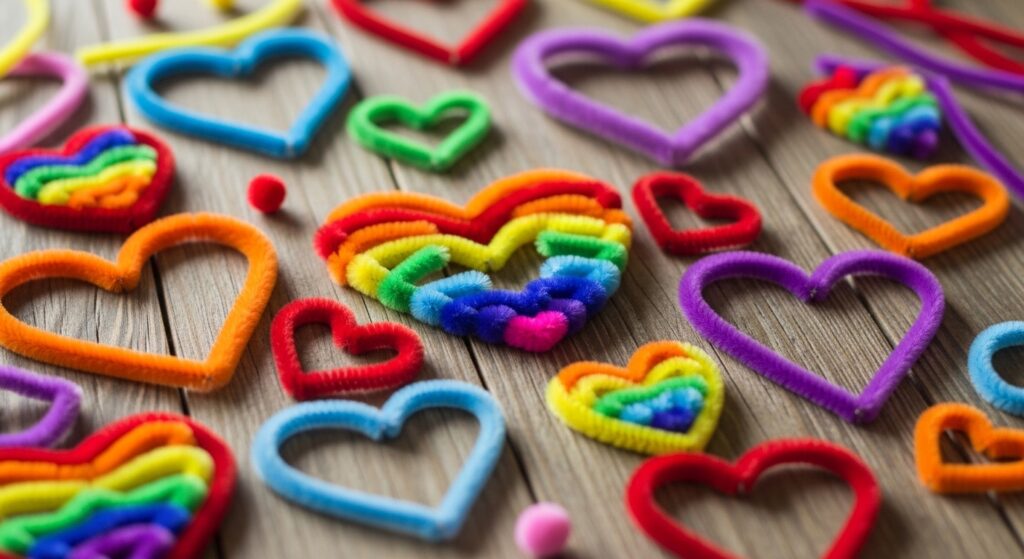Bend pipe cleaners into heart shapes by forming the top curves and bringing ends together at the point. Create rainbow collections or use traditional red and pink for Valentine’s Day. This simple project perfect for younger children teaches shape recognition while creating decorations for cards, gifts, or classroom displays.