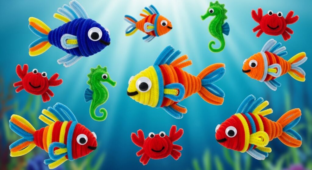 Create fish by forming oval body shapes, adding twisted fins and tails, and attaching googly eyes. Use bright tropical colors or realistic fish coloring. This ocean-themed craft supports marine biology lessons, teaches about aquatic life, and creates decorations for classroom aquarium themes or summer ocean unit studies.