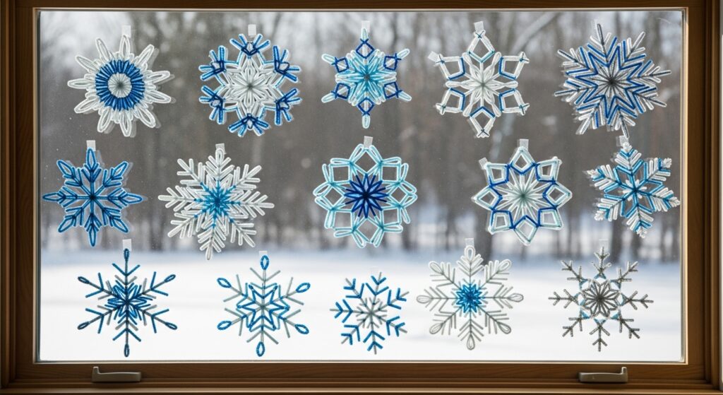 Form six-pointed snowflakes by crossing three pipe cleaners at centers, adding decorative twists and loops along arms. Discuss snowflake science and symmetry while creating winter decorations. This seasonal craft teaches geometry, symmetry, and winter weather science while producing beautiful decorations for windows, trees, or winter classroom displays.