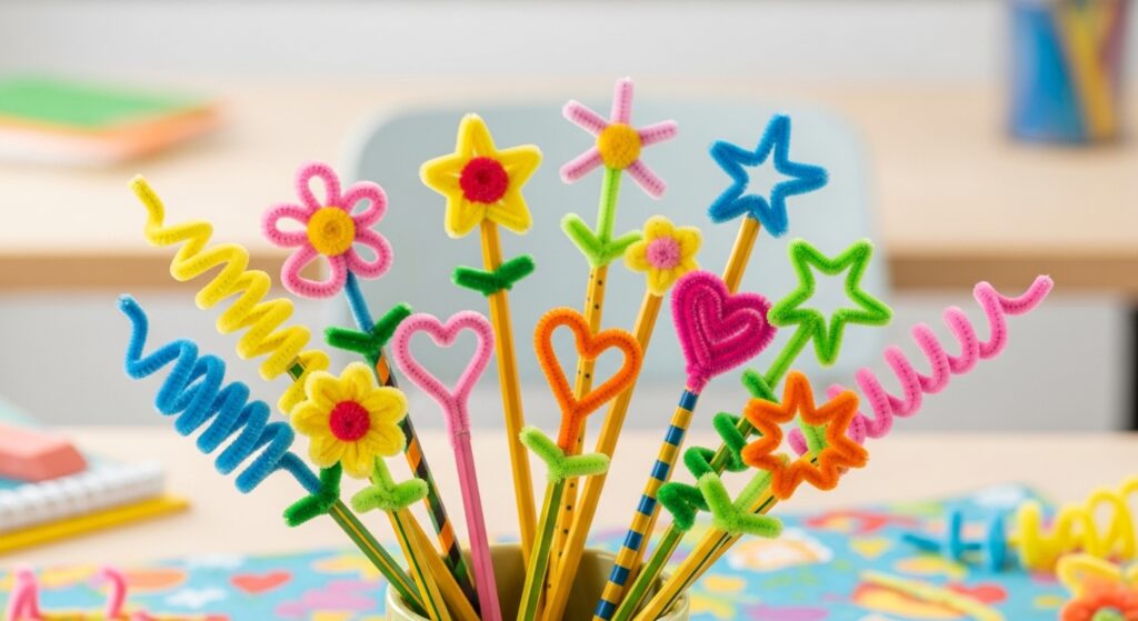 Form small decorative shapes fitting atop pencil erasers—flowers, stars, pom-poms, or animals. Kids personalize school supplies, making them easier to identify and more enjoyable to use. This practical craft creates functional items children actually use daily, demonstrating that handmade objects can serve practical purposes beyond decoration.