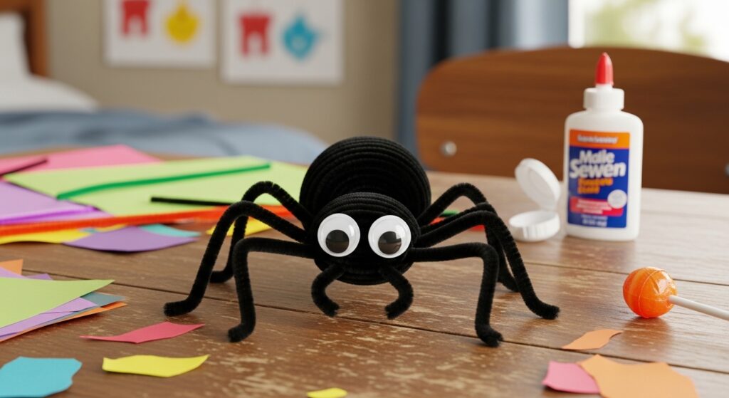 Create spiders by wrapping four pipe cleaners around a center point, then bending each in half to create eight legs. Curve legs into realistic spider positions and add googly eyes. This Halloween craft teaches counting, symmetry, and biology basics while remaining cute rather than frightening for sensitive children.